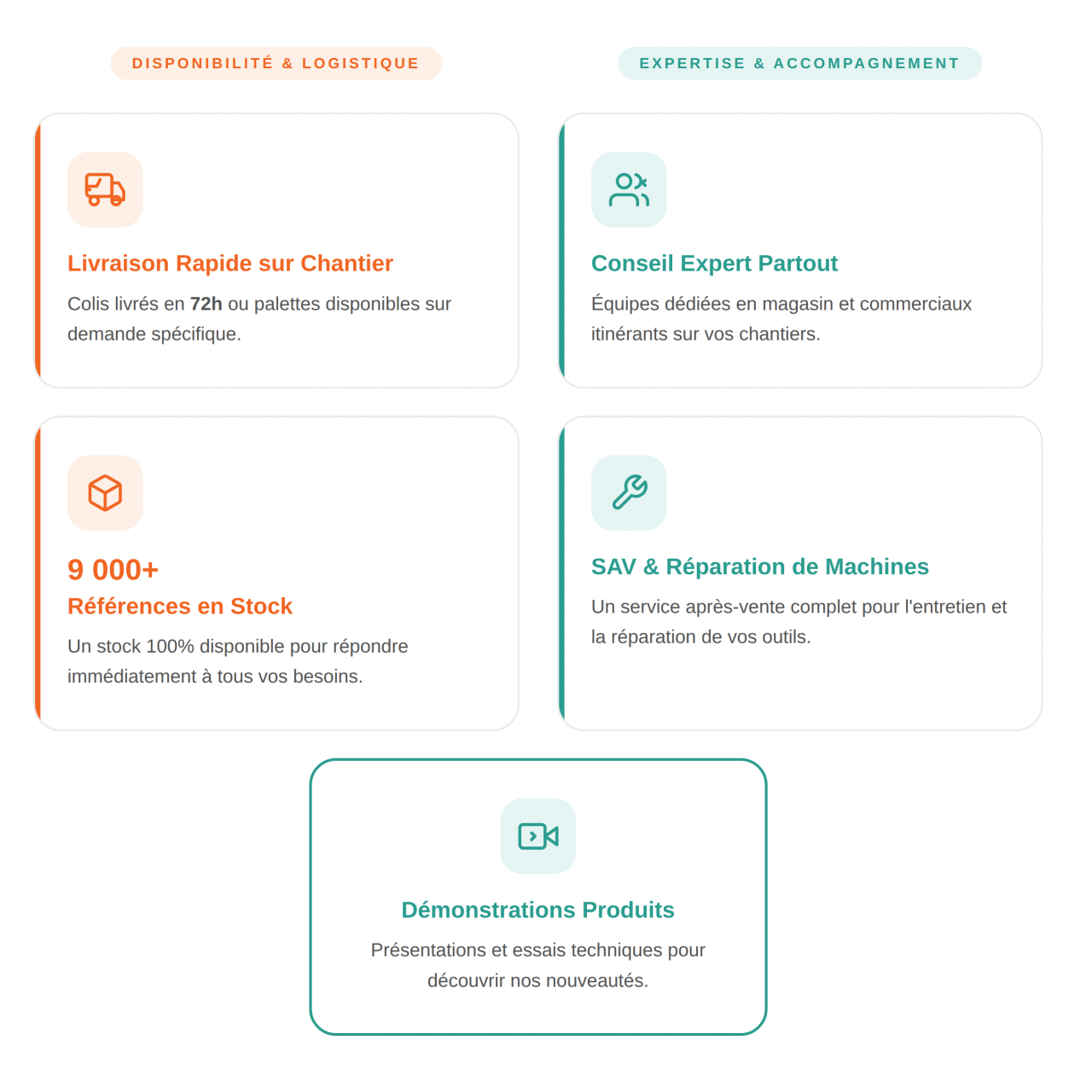 Nos équipes sont des professionnels du terrain qui connaissent les métiers du BTP de l'intérieur. En magasin, vous bénéficiez d'un conseil personnalisé sur le choix du matériel, les marques, les normes et les bonnes pratiques. Pas de script commercial : une vraie discussion entre pros pour trouver la solution adaptée à votre situation.